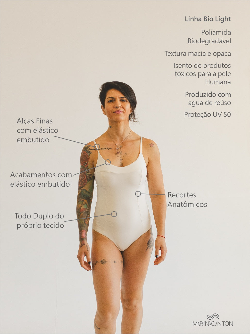 Fazendo parte da linha BIO, esta peça é confeccionada com poliamida biodegradável brasileira e inovadora, que se decompõe em até 3 anos após descarte em aterros sanitários — um salto de consciência frente às décadas exigidas pela poliamida tradicional.