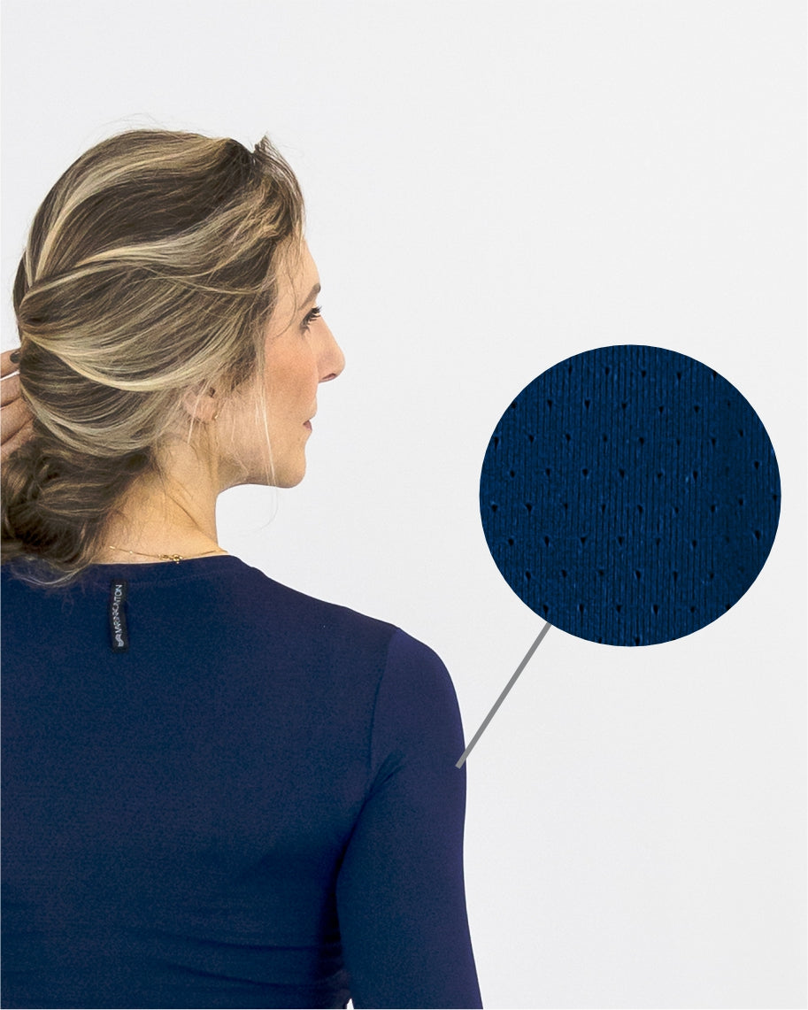 Tem excelente respirabilidade que ajuda na evaporação natural da transpiração, deixando a pele seca e fresca durante os exercícios.
