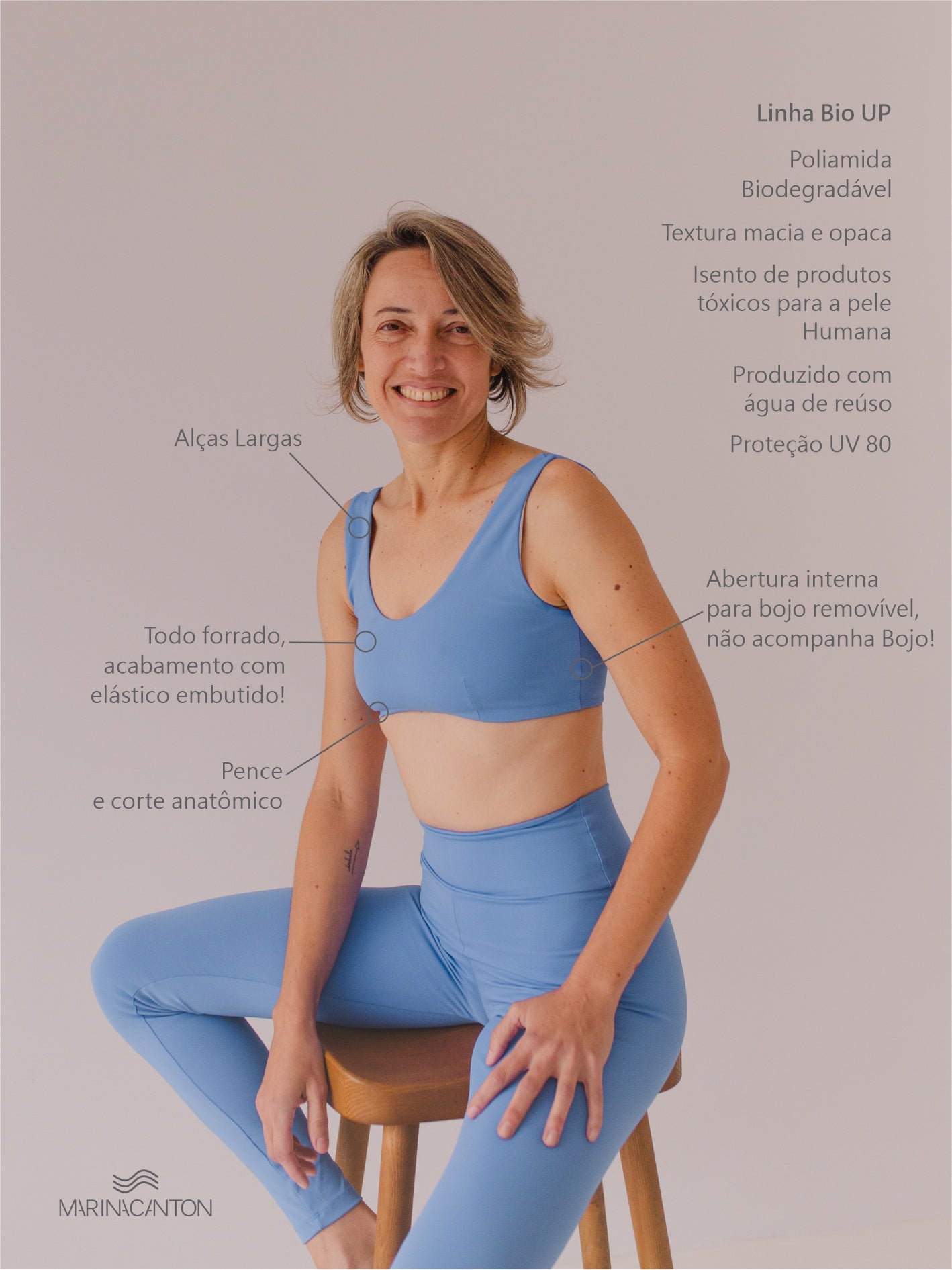 Confeccionado com Poliamida Biodegradável de alta qualidade, oferece tecnologia anti odor permanente e proteção UV 80.