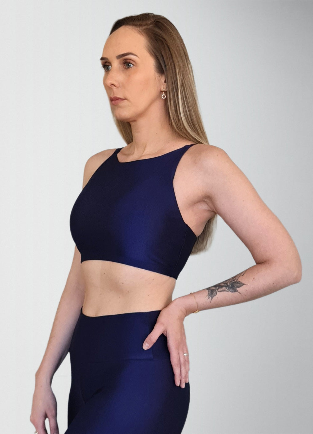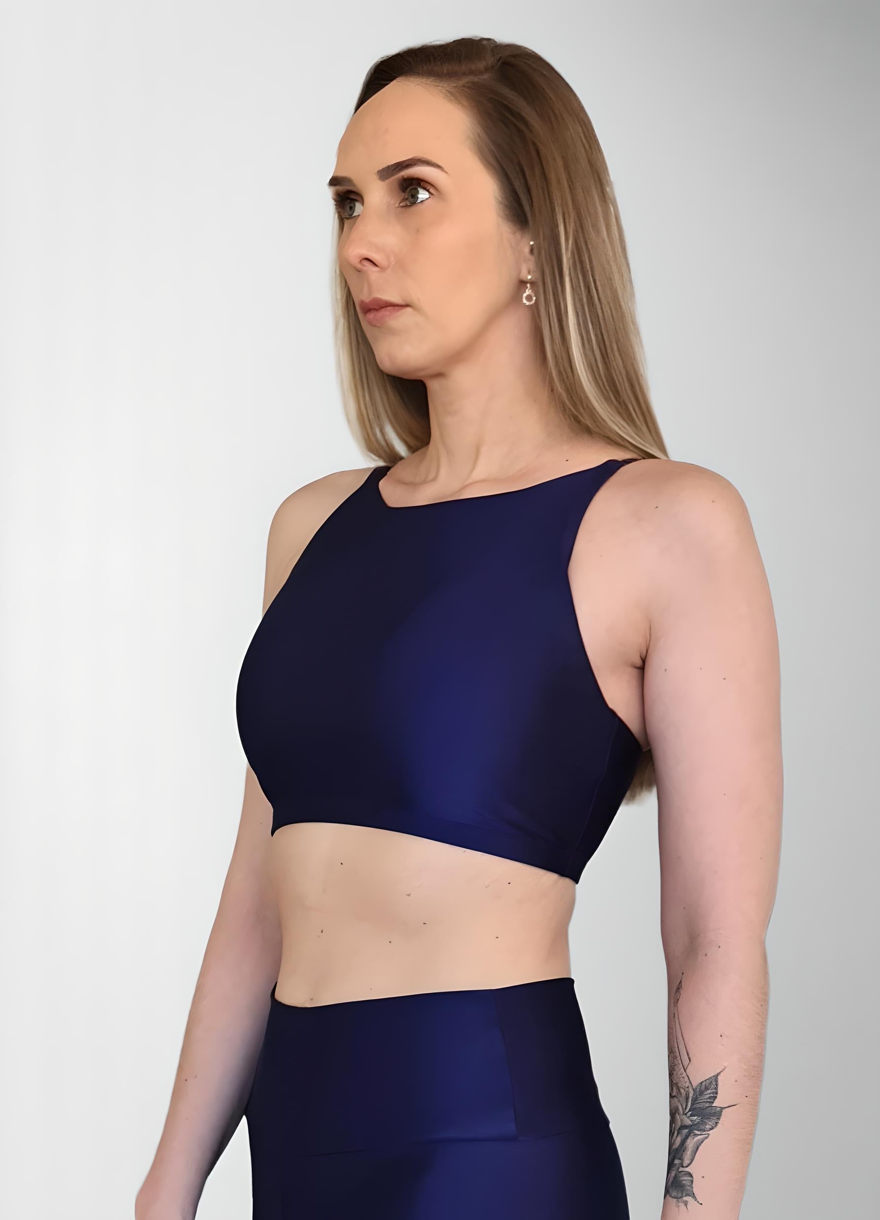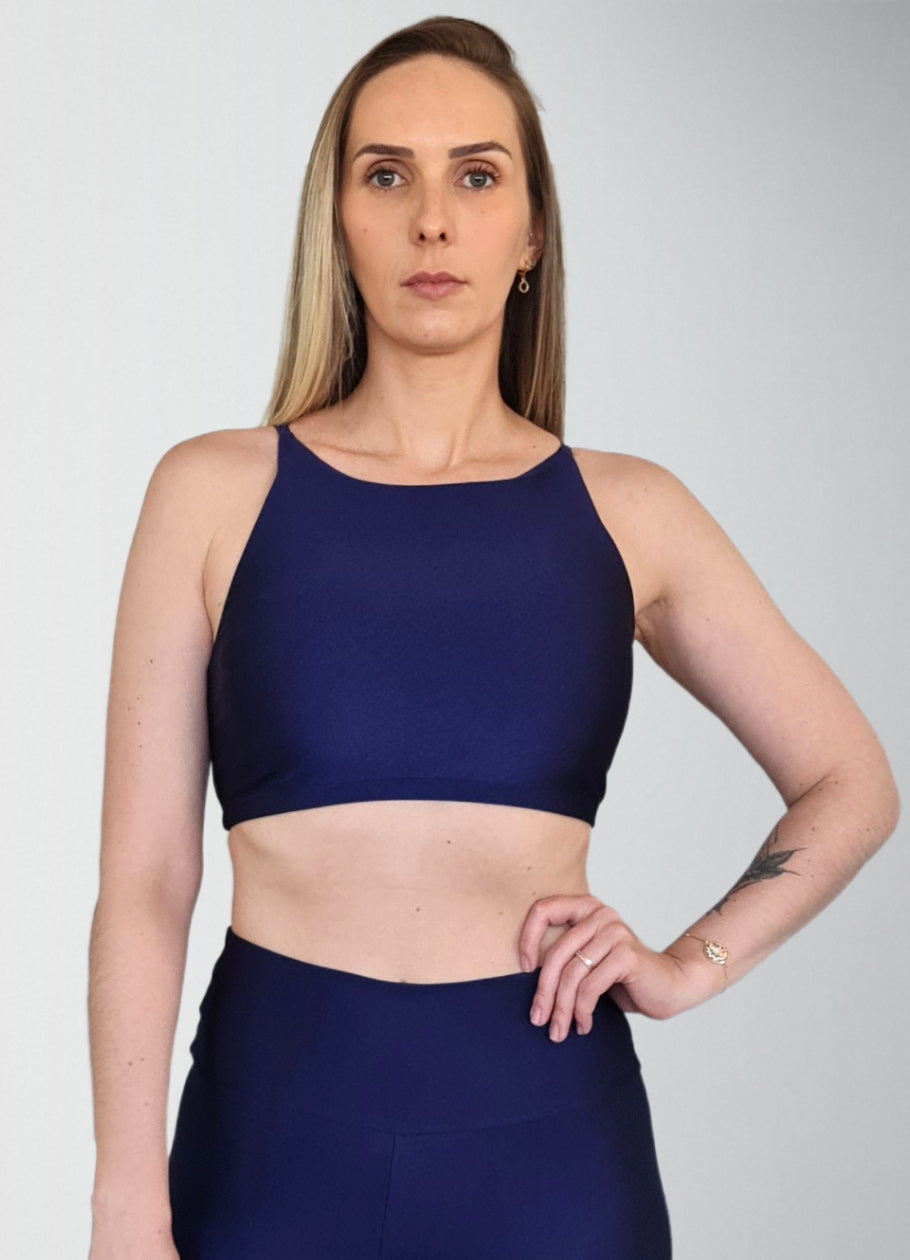 Top Spirit com alças cruzadas nas costas reforçada com elástico interno, tem decote frontal arredondado e fechado próximo ao pescoço, decote profundo nas costas. Top todo forrado com elástico embutido, e na cintura elástico de 1,5cm de largura. Sem Bojo, com abertura para bojo removível. Esta peça única une estilo, conforto e funcionalidade.